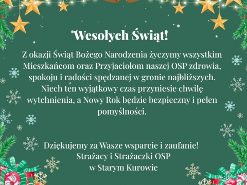 Zarząd Ochotniczej Straży Pożarnej w Starym Kurowie oraz Druhny i Druhowie pragną życzyć wszystkim zdrowych, spokojnych, pogodnych i szczęśliwych świąt Bożego Narodzenia, abyśmy mogli spędzić je w gronie najważniejszych nam osób. Życzymy... więcej